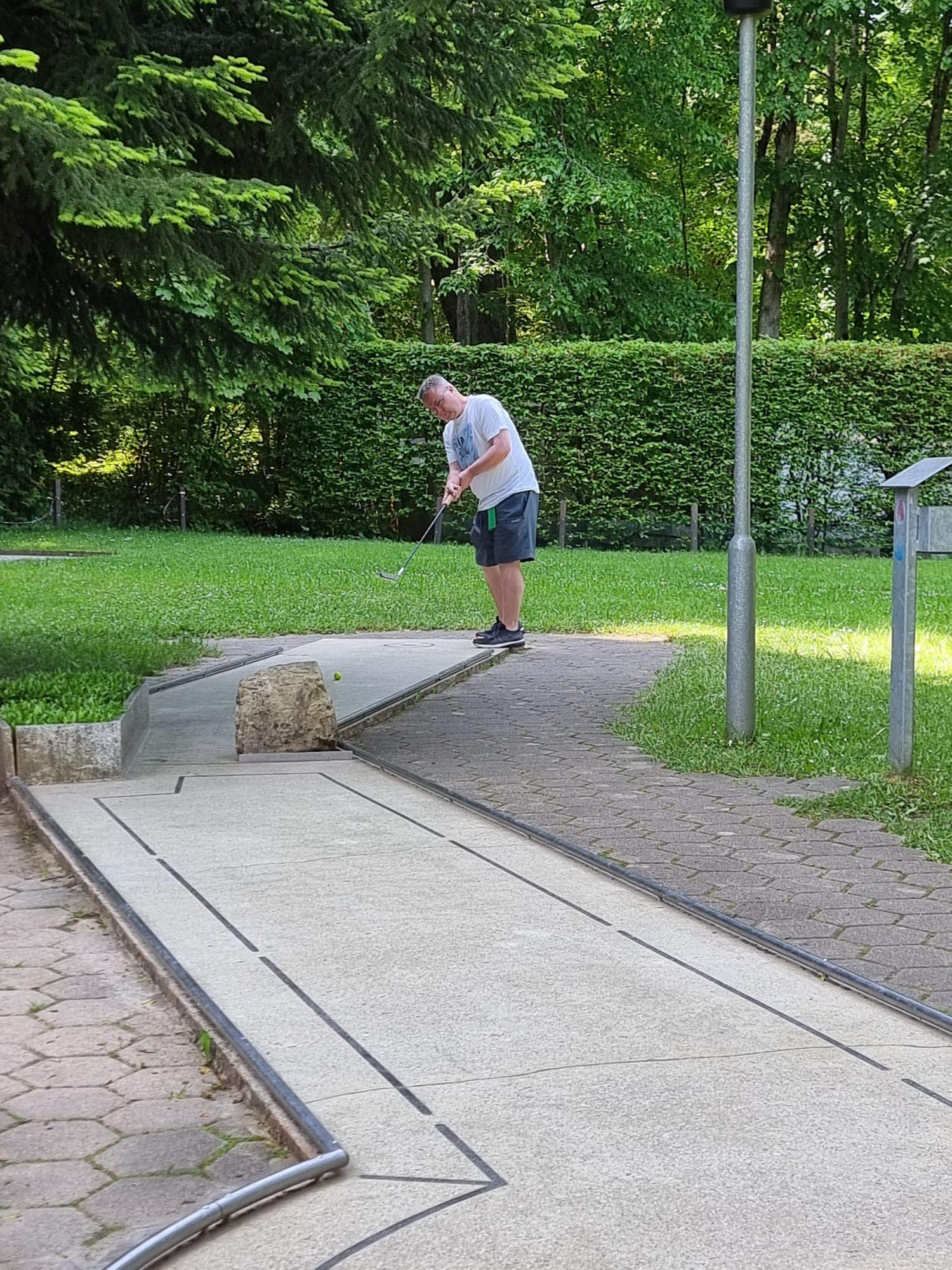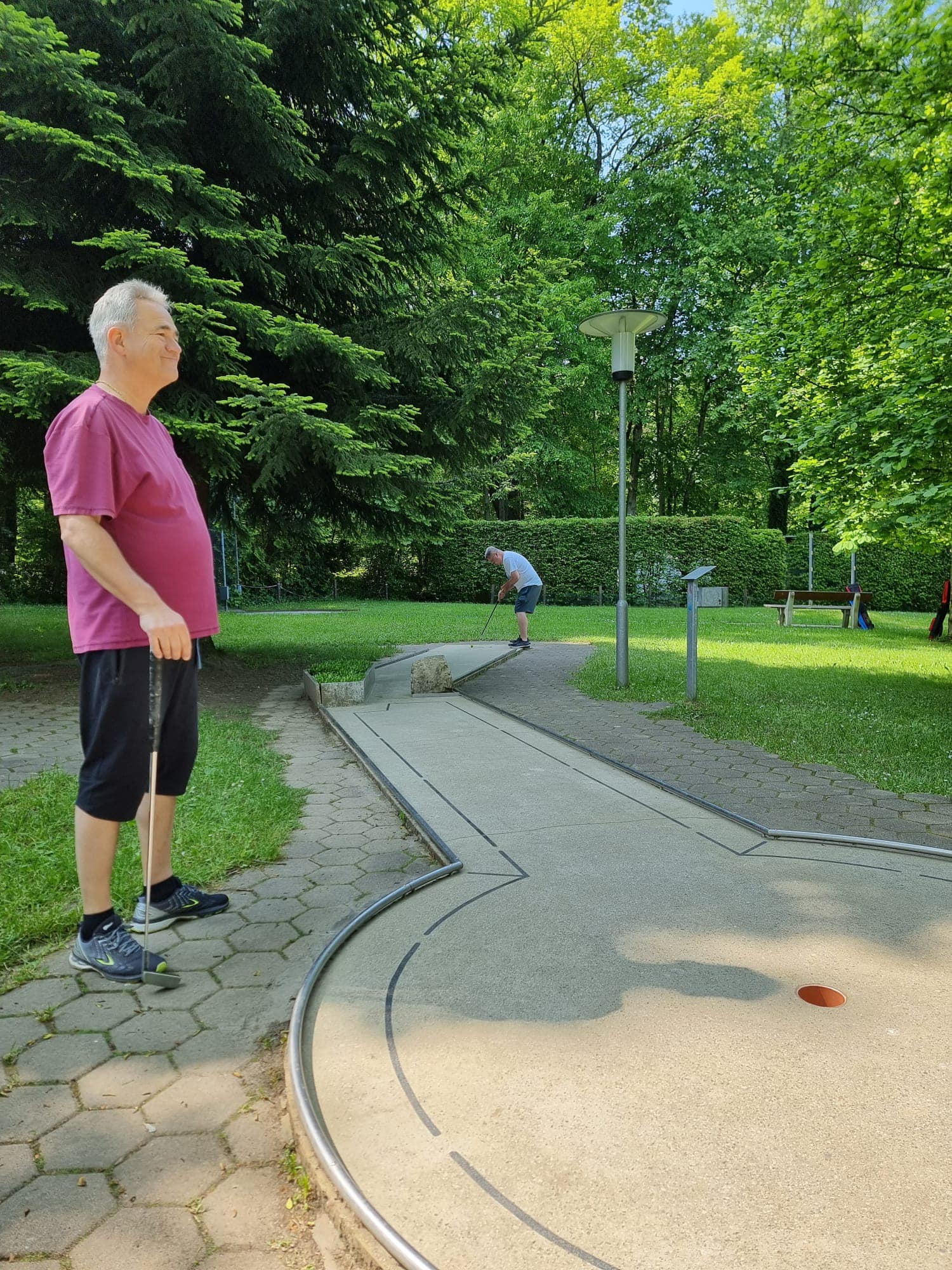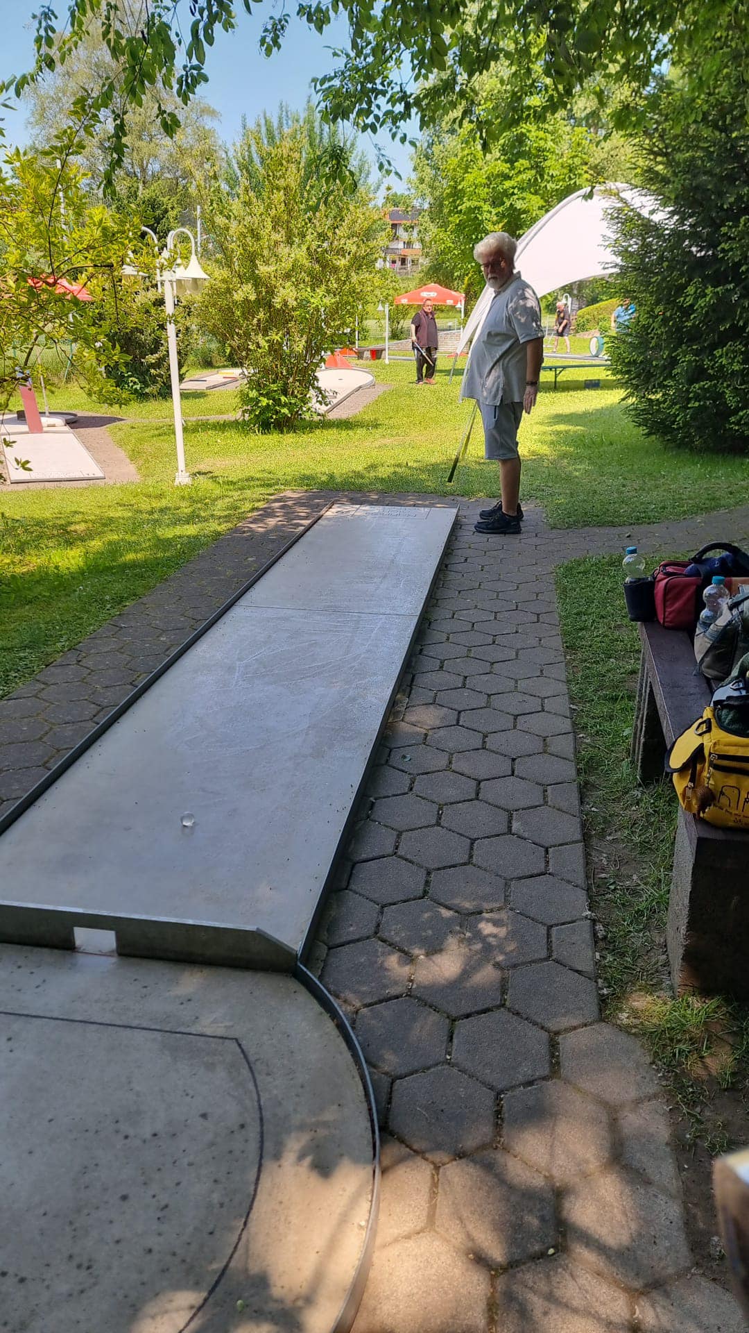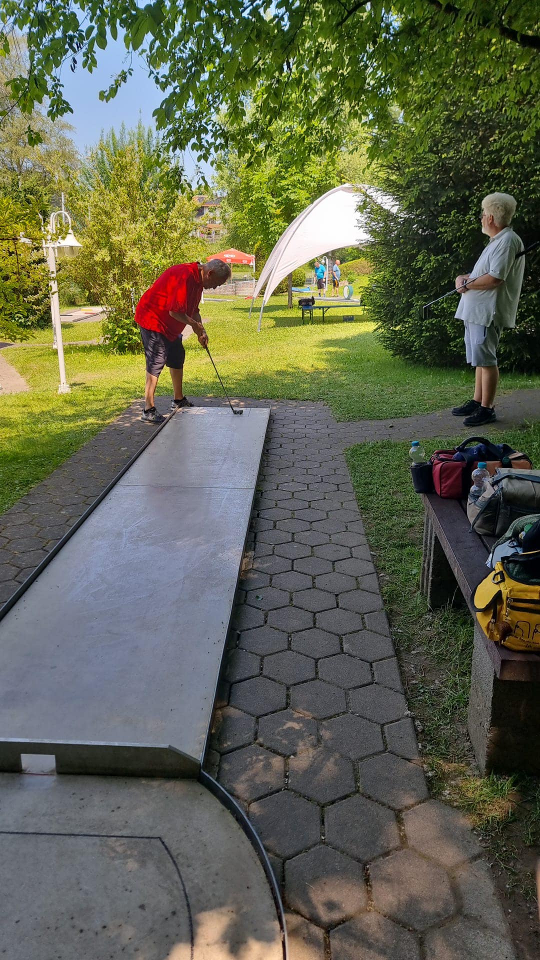 Zusätzlich spielte das Wetter auch nicht so wirklich mit. An den Trainingstagen waren es schwüle 30 bis knapp 37 Grad Celsius, die das Spielen nicht gerade angenehm machten. Darum ging man am Freitag Nachmittag noch ins Freibad, das direkt gegenüber von der Minigolfanlage lag. Dort konnte man sich von dem Training abkühlen. Nachdem bei Rekordhitze trainiert wurde, gab es dann am Spieltag 18 bis 22 Grad mit viel Regen, sodass man einiges am Ballmaterial kurzfristig hat umstellen müssen. Aufgrund des andauernden Regens wurde das Turnier auf zwei Runden verkürzt. Nachdem ein Teil der Spieler noch früh ins Turnier starten konnte, wurde dieses nach etwa einer halben Stunde bis 13 Uhr unterbrochen. Ab dem Zeitpunkt konnte einigermaßen gut durchgespielt werden. Angesichts der Witterungsverhältnisse war jede grüne Runde (unter 24) Gold wert. Die erste Mannschaftsrunde brachte keine Entscheidung und es wäre tatsächlich noch gut möglich gewesen, dass wir die vier Punkte auf Süßen noch verlieren könnten. Mit 123 Schlägen waren wir nur zwei Schläge vor allen anderen drei Mannschaften. Zum Schluss setzten wir uns gegen Pegnitz und Süßen durch und mussten uns nur gegen Heilbronn geschlagen geben.